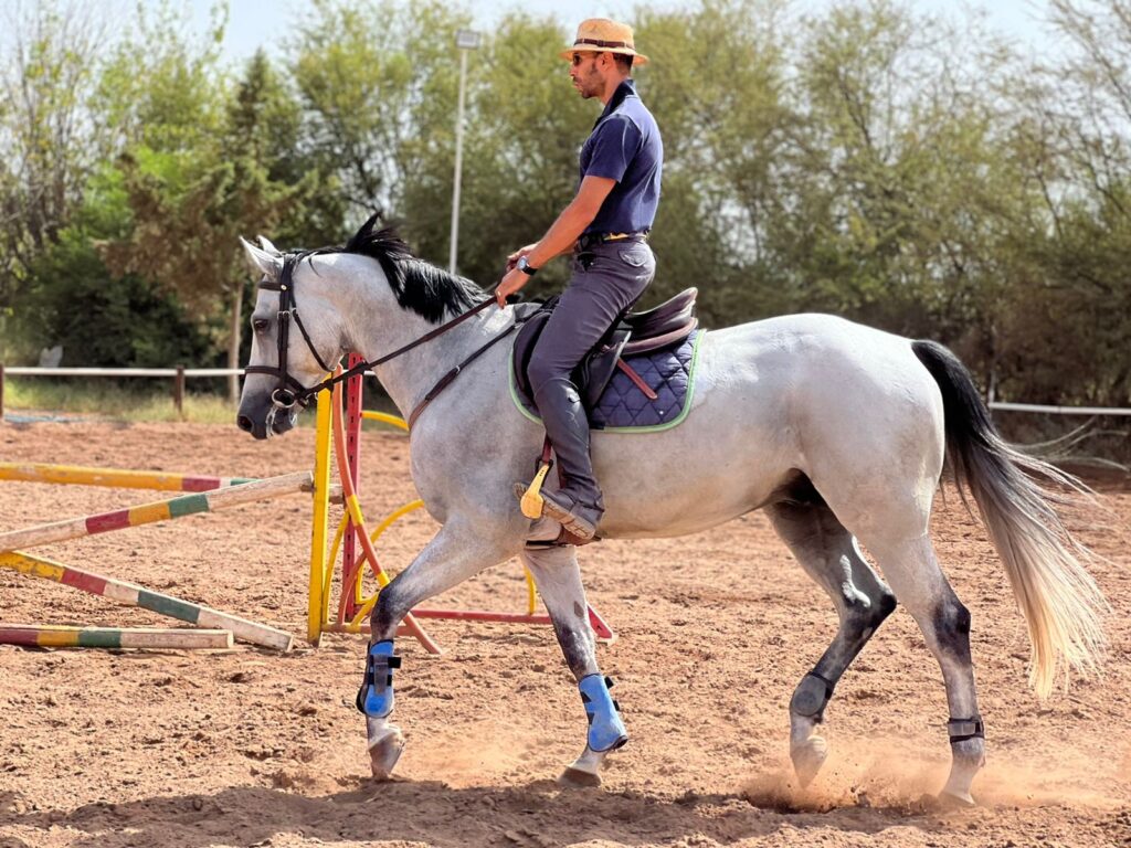 Le travail monté peut associer dressage et saut d’obstacles, afin d’améliorer la qualité des aides, la précision, l’équilibre, la gestion de l’effort et la cohérence du couple cavalier–cheval.